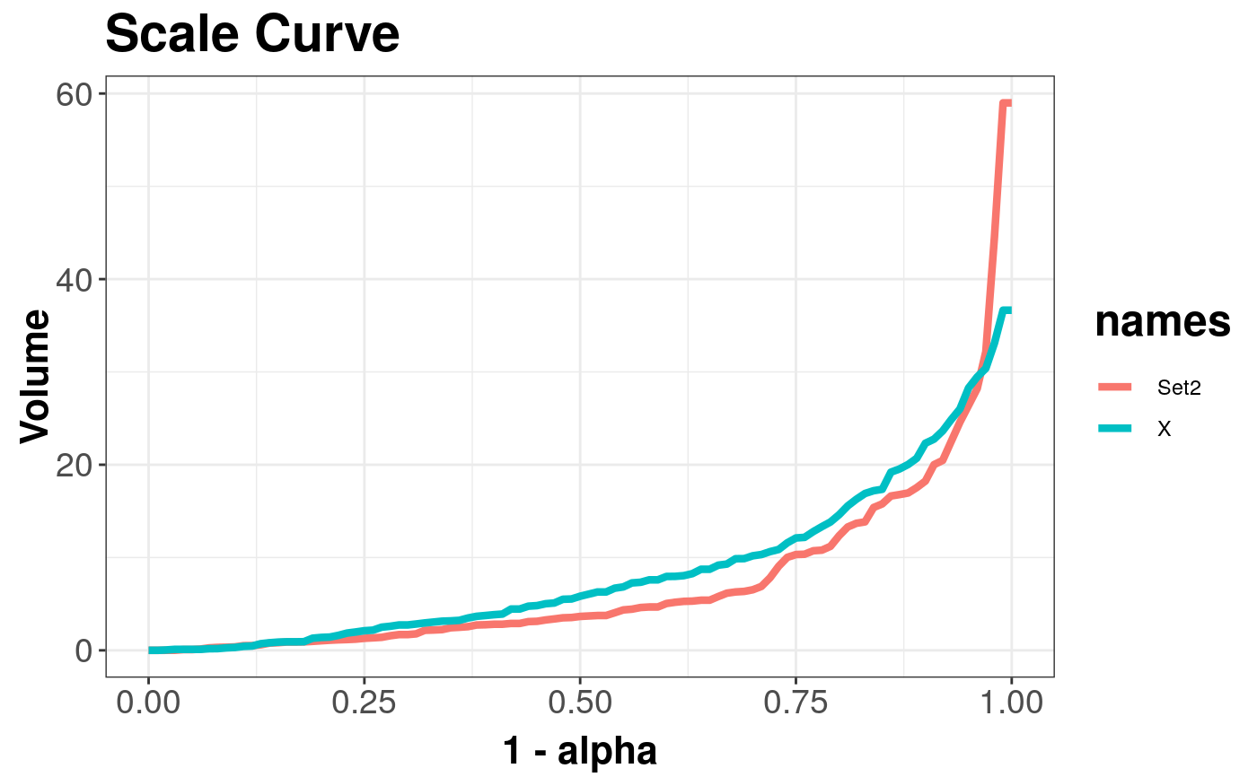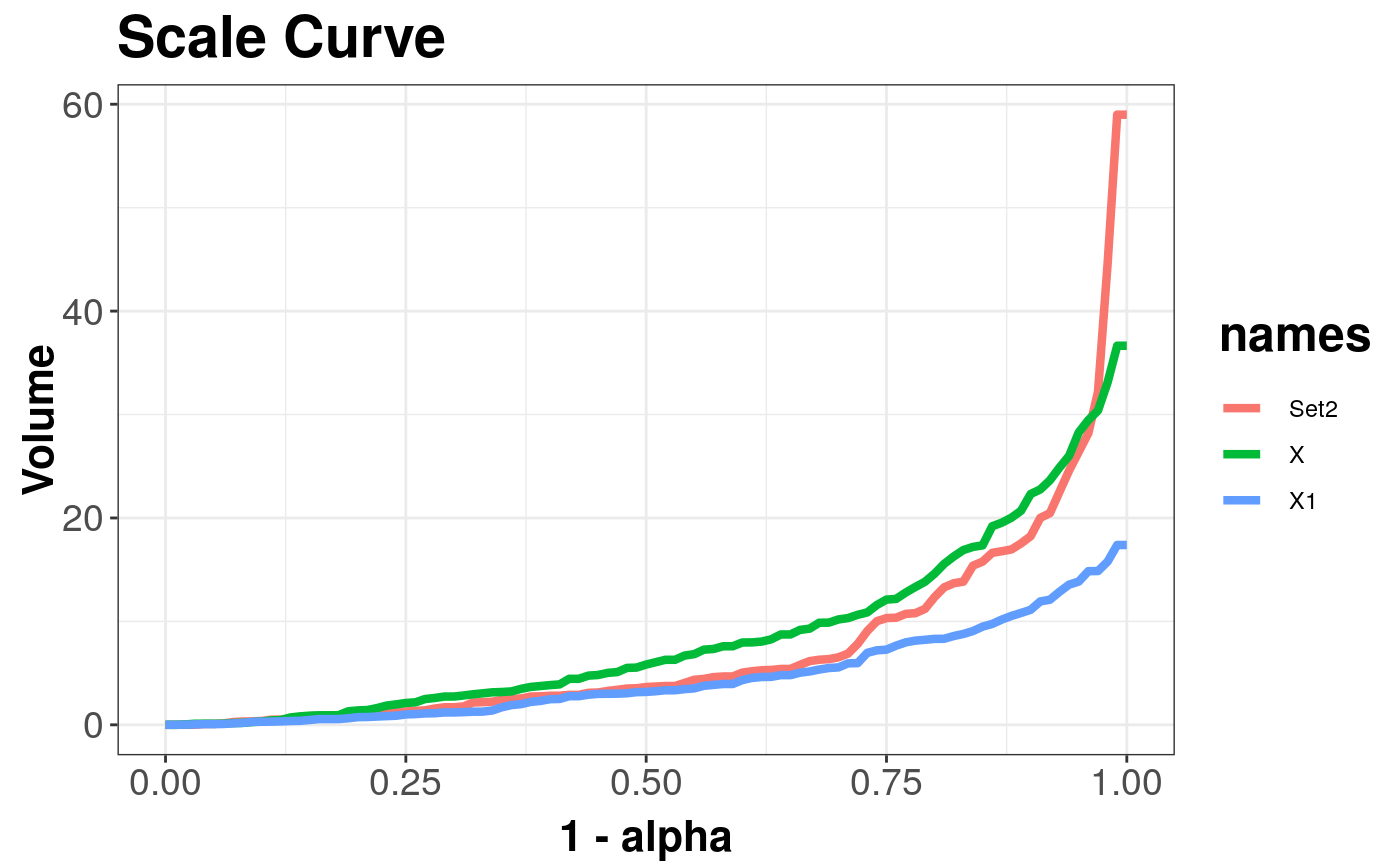 library(mvtnorm) x <- mvrnorm(n = 100, mu = c(0, 0), Sigma = 2 * diag(2)) y <- rmvt(n = 100, sigma = diag(2), df = 4) s1 <- scaleCurve(x, depth_params = list(method = "Projection")) s2 <- scaleCurve(y, depth_params = list(method = "Projection"), name = "Set2") sc_list <- combineDepthCurves(s1, s2) # Add one curve to another plot(sc_list) # Draw plot with two curvesz <- mvrnorm(n = 100, mu = c(0, 0), Sigma = 1 * diag(2)) s3 <- scaleCurve(z, depth_params = list(method = "Projection")) plot(combineDepthCurves(sc_list, s3)) # Add third curve and draw a plot#> Warning: Names in DepthCurveList are not unique!